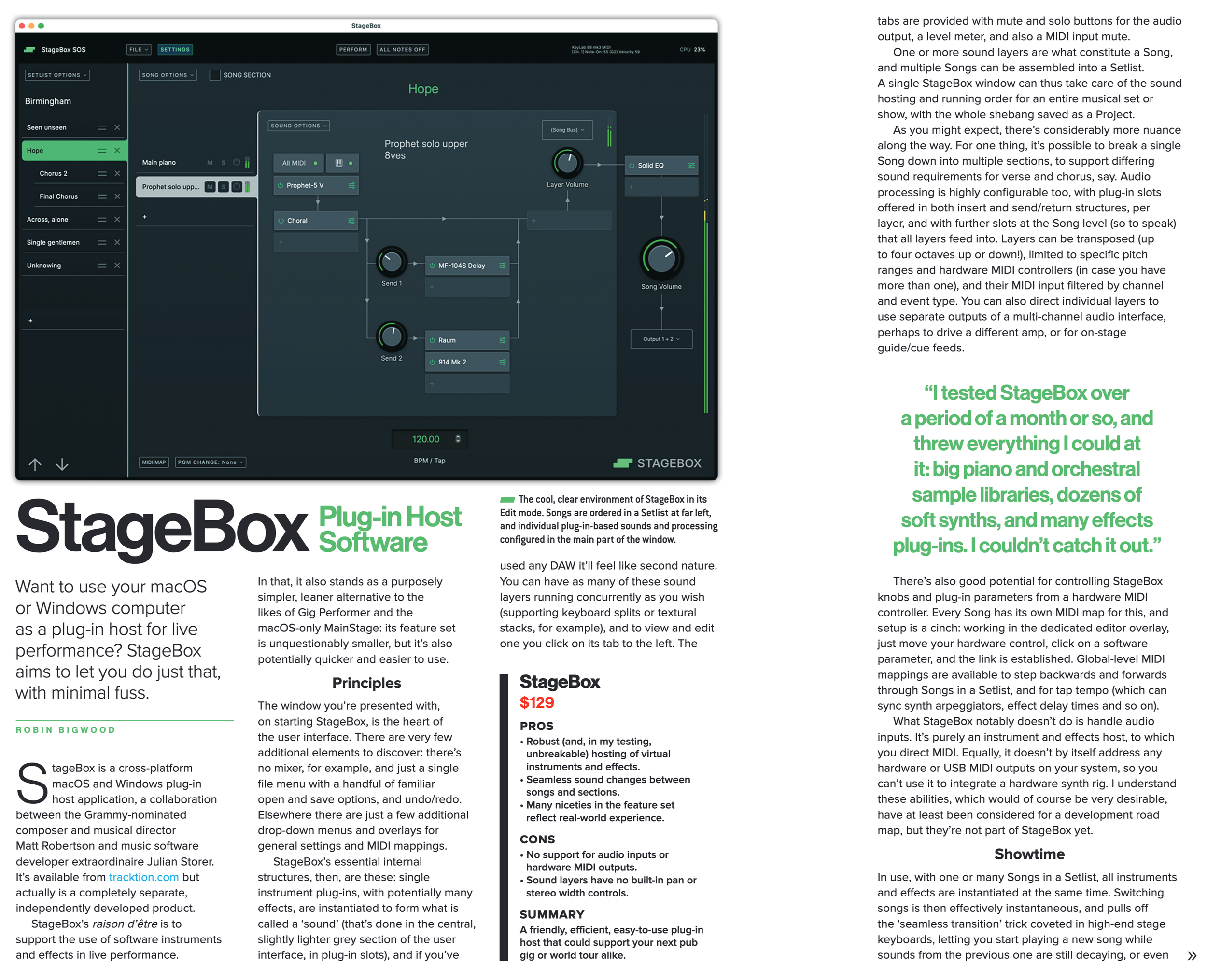 I tested StageBox over a period of a month or so . . . I couldn’t catch it out. It proved rock solid, and I wouldn’t hesitate to use it on stage. A friendly, efficient, easy to use plug-in host that could support your next pub gig or world tour alike.